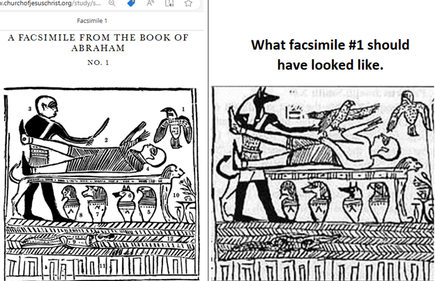 Instead, we can analyze the facsimiles for ourselves and see where it takes us. Let’s start with Facsimile #1. As previously mentioned, this picture had some missing fragments. This meant that God had to give Jospeh Smith divine powers and knowledge to sketch in the missing parts and complete the picture so that he could “translate” the Book of Abraham: