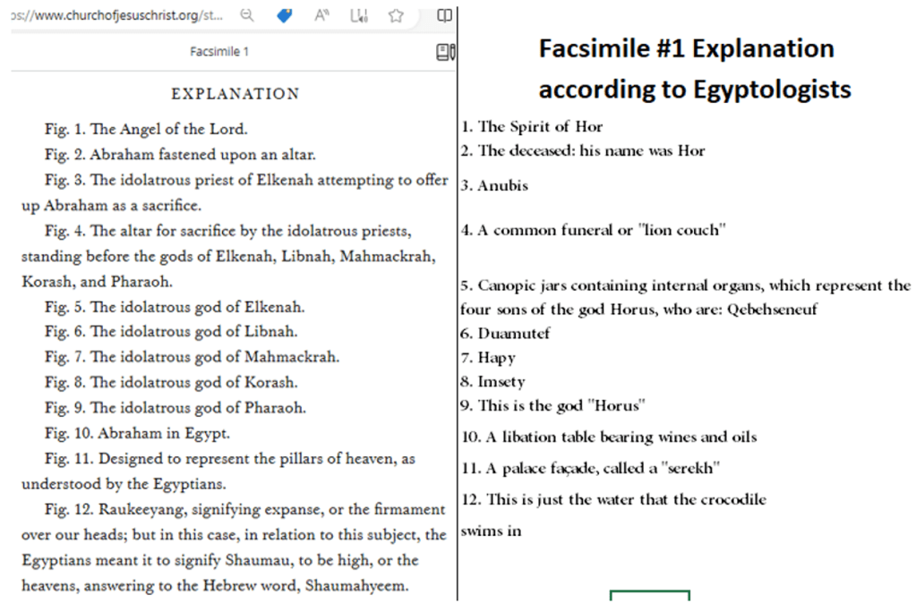 Scholars know that the picture on the right is a correct representation of the entire facsimile because they’ve discovered many other pagan funeral instructions in Egypt that are identical to facsimile. They all look like the picture on the right. Joseph Smith also listed the explanation/translation of the facsimile. You’ll notice that there are numbers on Joseph Smith’s facsimile. He goes through and tells us what each numbered figure is translated as. Let’s compare what Joseph Smith said against what the Egyptologists said: