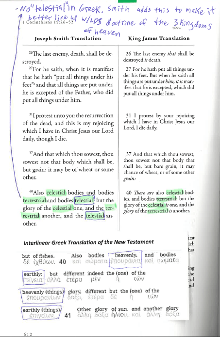 Joseph Smith wants it to be abundantly clear that this verse is talking about the 3 kingdoms of heaven as taught by the LDS Church. I’ve also included a clip from the Interlinear Greek for further clarification as to what the correct words in this passage are. There is no Greek word for “telestial.” It was never written in Paul’s letter to the Corinthians. Smith simply dictated to add this word into the verse.