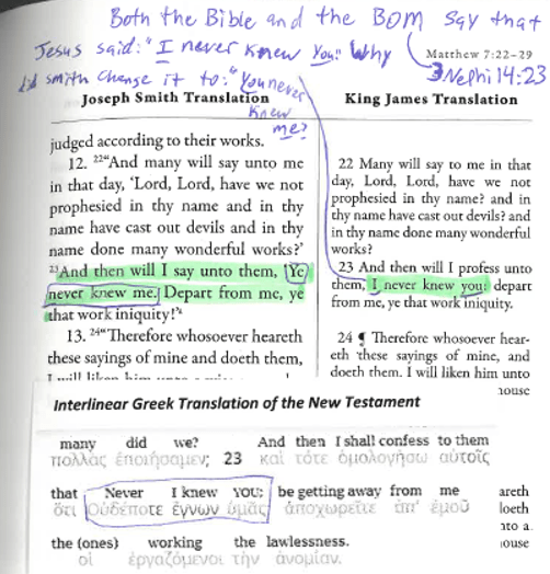This next one is intriguing. We know that there are a number of passages from the KJV that are also in the BOM. An example of this is Matthew 7:23. In the KJV, this verse reads, “I never knew you.” In the BOM in 3 Nephi 14:23, it says the same thing, “I never knew you.” Yet in the JST, Smith changed this verse and to make it say, “You never knew me.”
