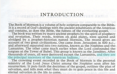 The LDS Church acknowledged this and that is what led to that slight change on this introduction page. They know that their previous wording of the Lamanites being “the principal ancestors of the American Indians” is false. So they had to change it so that it now it reads that the Lamanites are “AMONG the ancestors of the American Indian.”