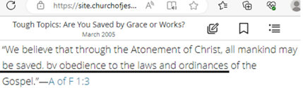 - This is the LDS Church’s 3rd Article of Faith. There are 13 Articles of Faither for the LDS Church, which is like a statement of their beliefs. Given the information from the previous screenshots, it is easy to understand how it all comes together and why the things we must do are called, “saving ordinances.” Without these essential ordinances/temples works, we cannot enter into the presence of God.