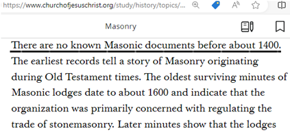 A number of Latter Day Saints claim that masonic practices can be traced all the way back to Solomon’s temple. Yet throughout the entire Bible and the Book of Mormon, you don’t see any mention of spouses being sealed (temple marriages) nor do we read anything about token handgrips and special phrases you must memorize if you wish to enter into the celestial room. There is no evidence to suggest that Moses, Solomon or any other prophet practiced these rituals. In fact, masonry wasn’t even invented until the 1,400’s and the LDS Church acknowledges this: