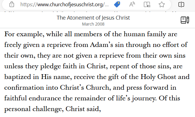 “They are NOT freely and universally given a reprieve OF THEIR OWN SINS UNLESS they pledge faith in Christ, repent of those sins, are baptized in his name, receive the gift of the Holy Ghost and CONFIRMATION INTO CHRIST’S CHURCH, and press forward in faithful endurance the remainder of life’s journey.”