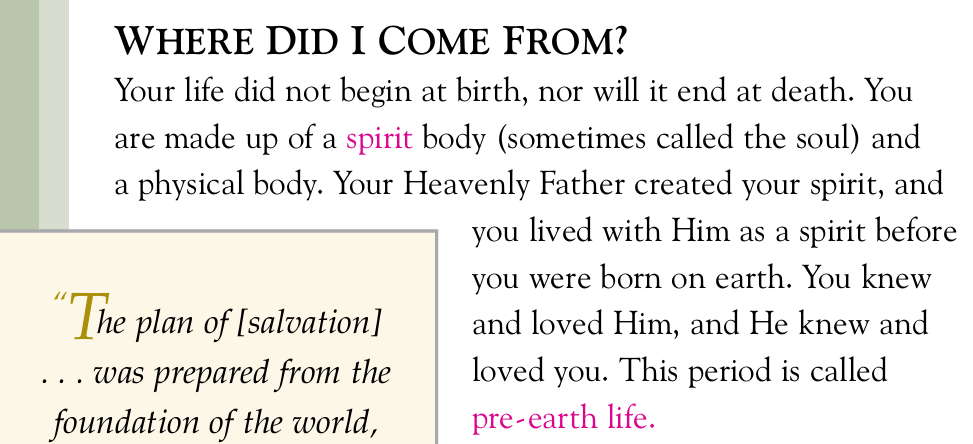 “Your life did not begin at birth, nor will it end at death…Your Heavenly Father created your spirit, and you lived with Him as a spirit before you were born on earth. You knew and loved Him, and He knew and loved you. This period is called pre-earth life.”